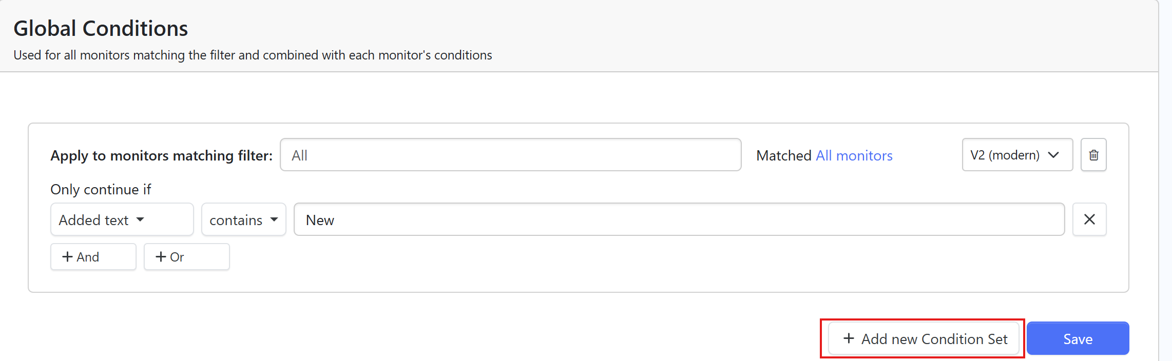 I need to monitor a specific area on multiple webpages for certain text (e.g., “New” ). When this text appears in that area, I’d like to receive a notification. To make things more efficient, I want to bulk import multiple webpage links and monitor them with the same condition. However, when trying to import the links via a CSV file, I ran into an issue. I can’t seem to apply the same condition to all the links at once.