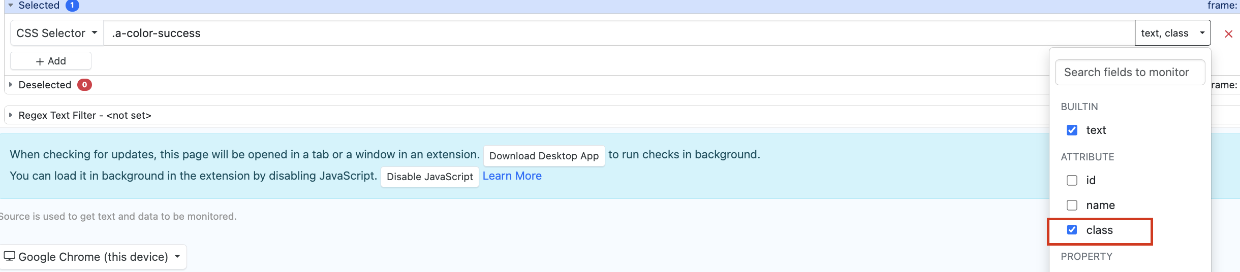 icon inside the “Edit Options” of the monitor and checking the “class” under Attribute of that element as shown below: