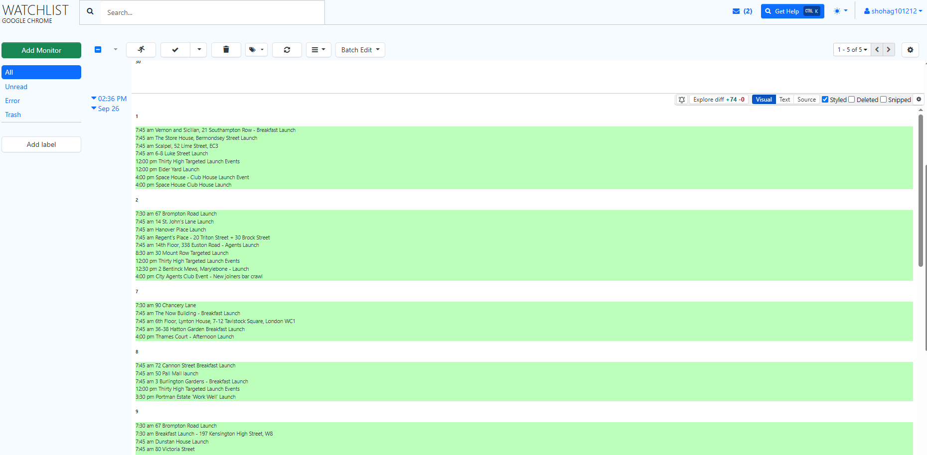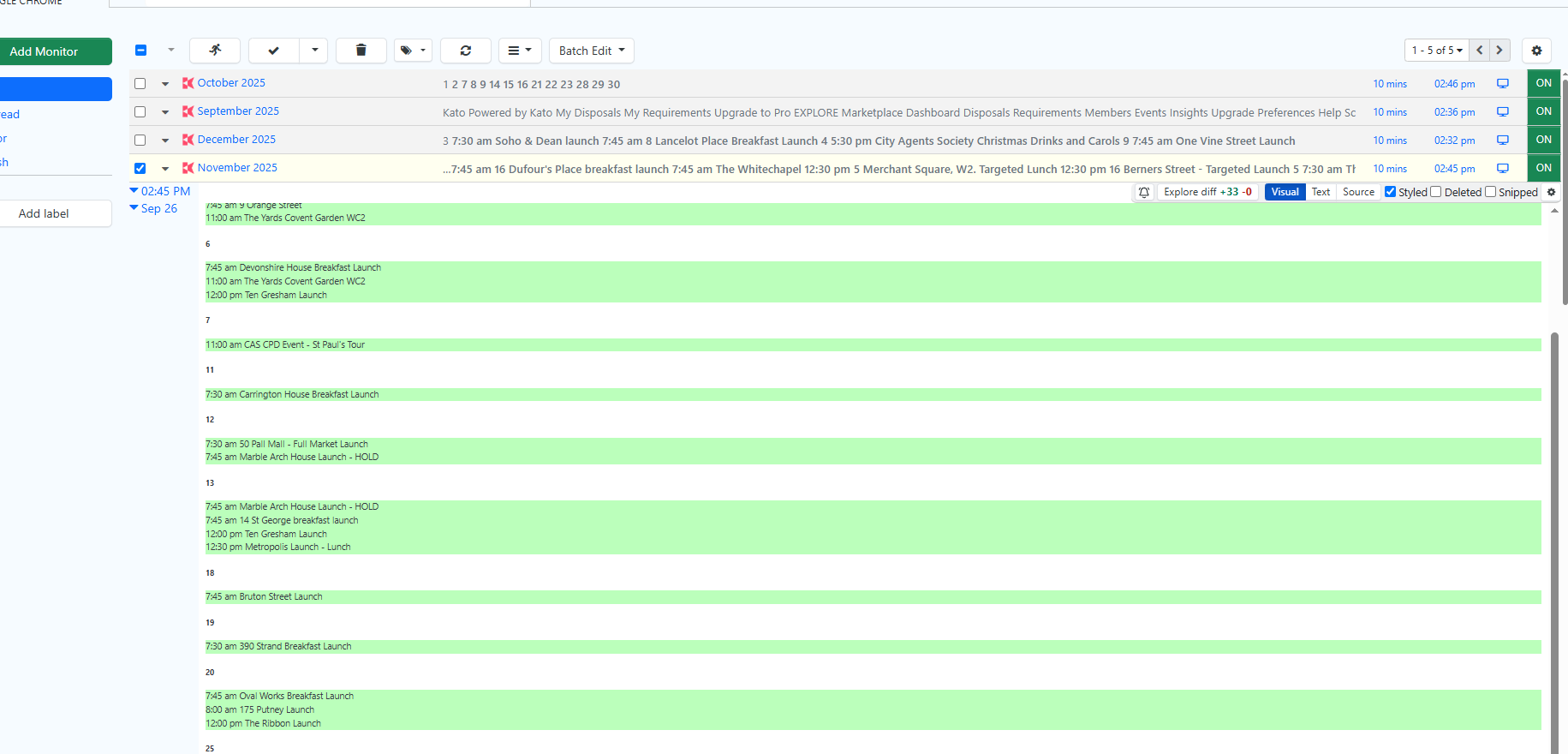 I’m having an issue with my Distill account. Normally, when it checks every 10 or 30 minutes, it notifies me of changes. Right now, it’s only showing all green instead of highlighting specific changes (screenshot attached).
