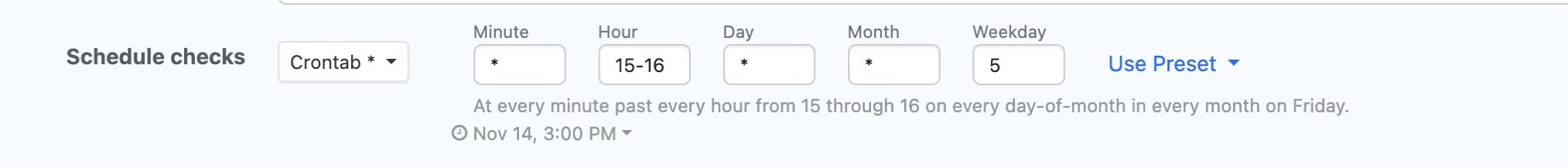 This Schedule check option—allowing monitor to run checks on specific days and within precise time intervals—is supported through Crontab. Please note that this feature is available on all paid plans.