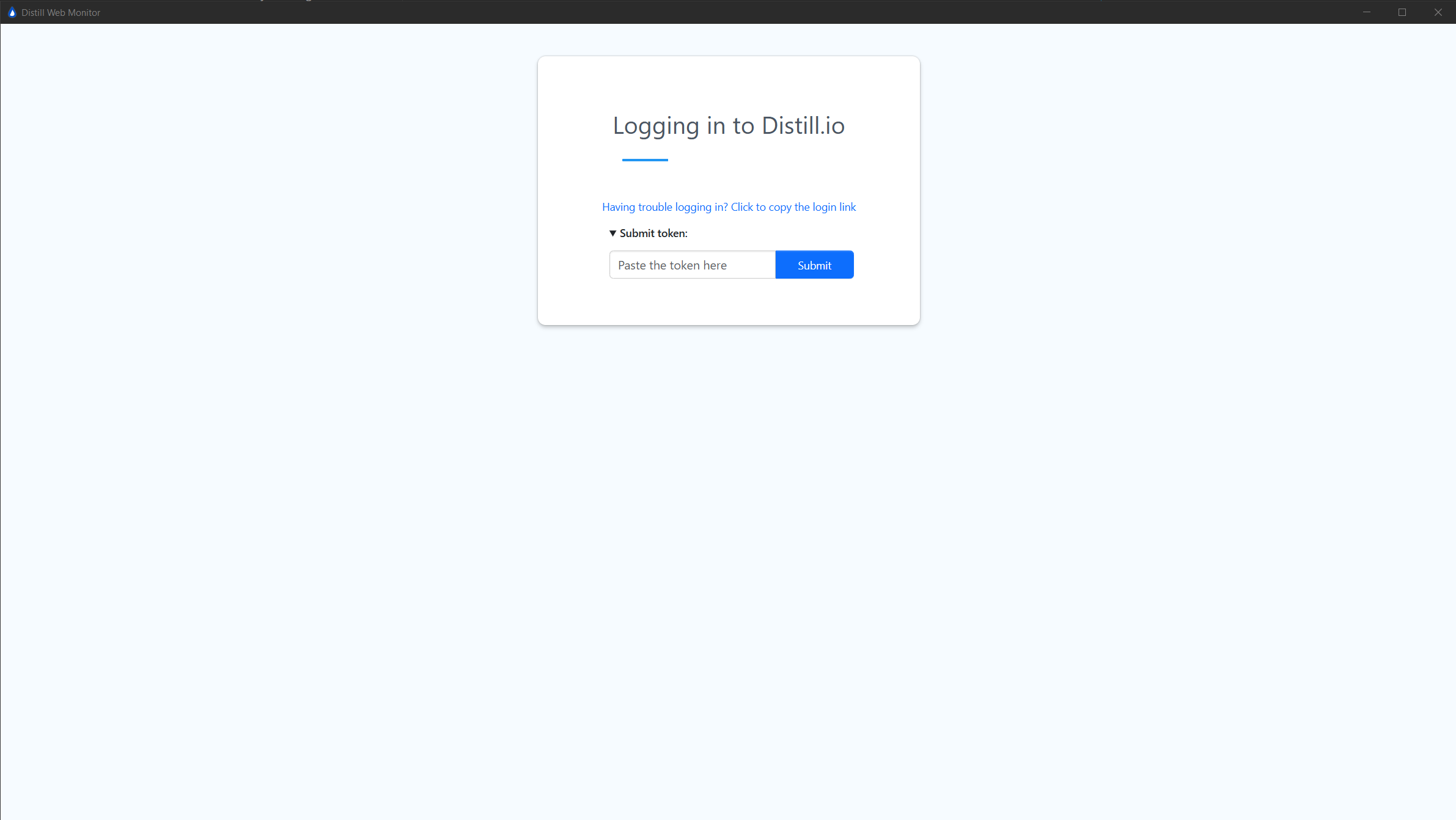 If you are not able to see the page shown in the screenshots above, you can try clearing the app’s local data and the launching the app again. To do that, delete the directory in the following path: C:\Users\<your_username>\AppData\Roaming\Distill Web Monitor