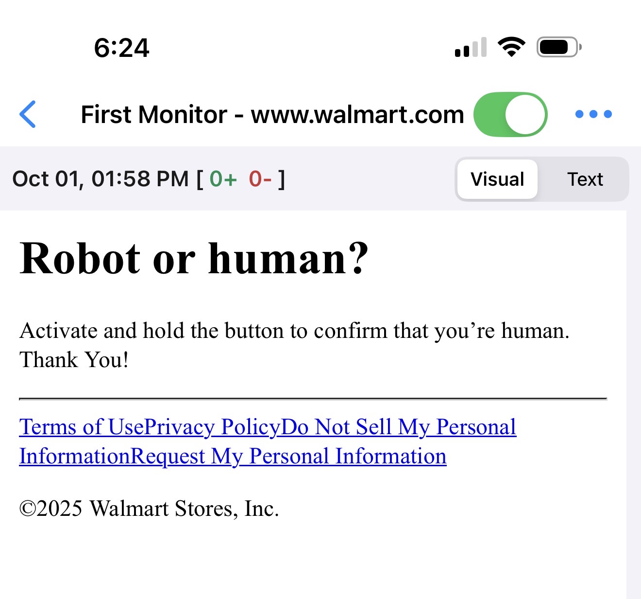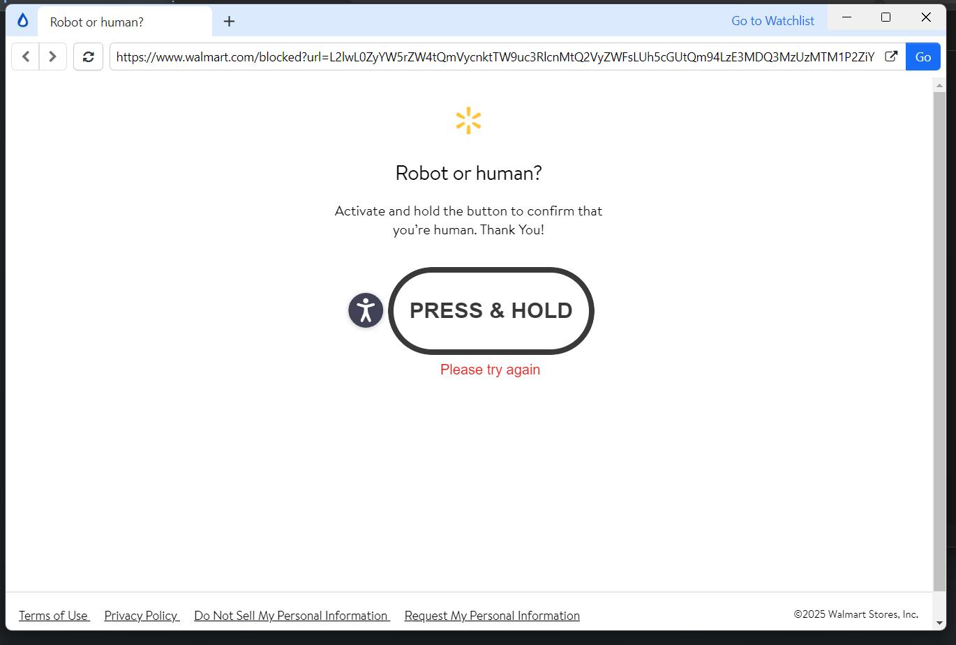 I’m attempting to set up an alert, but testing the conditions is always blocked by a Walmart check that says “Robot or human? Activate and hold the button to confirm that you’re human. Thank You!” Any idea if it’s possible to get around that block?